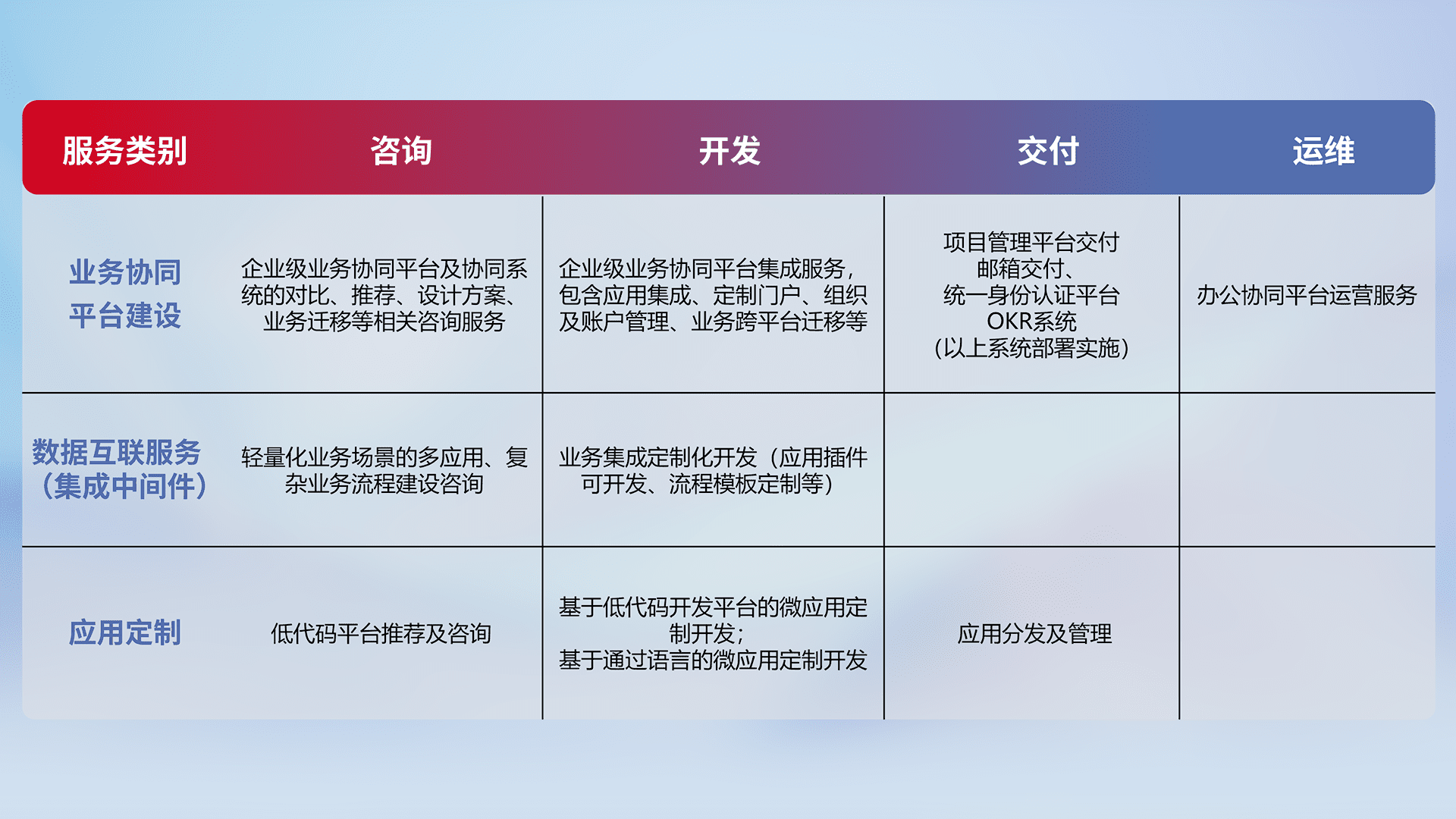 针对钉钉、、、企微、、、IDaas等平台级产品提供产品的规划、、、、方案、、、交付、、、定制化开发等服务,,,,实现如统一协同办公、、智能客户服务、、、混合会议管理、、、智能数据查询、、、等业务场景,,,实现数字化转型。。。