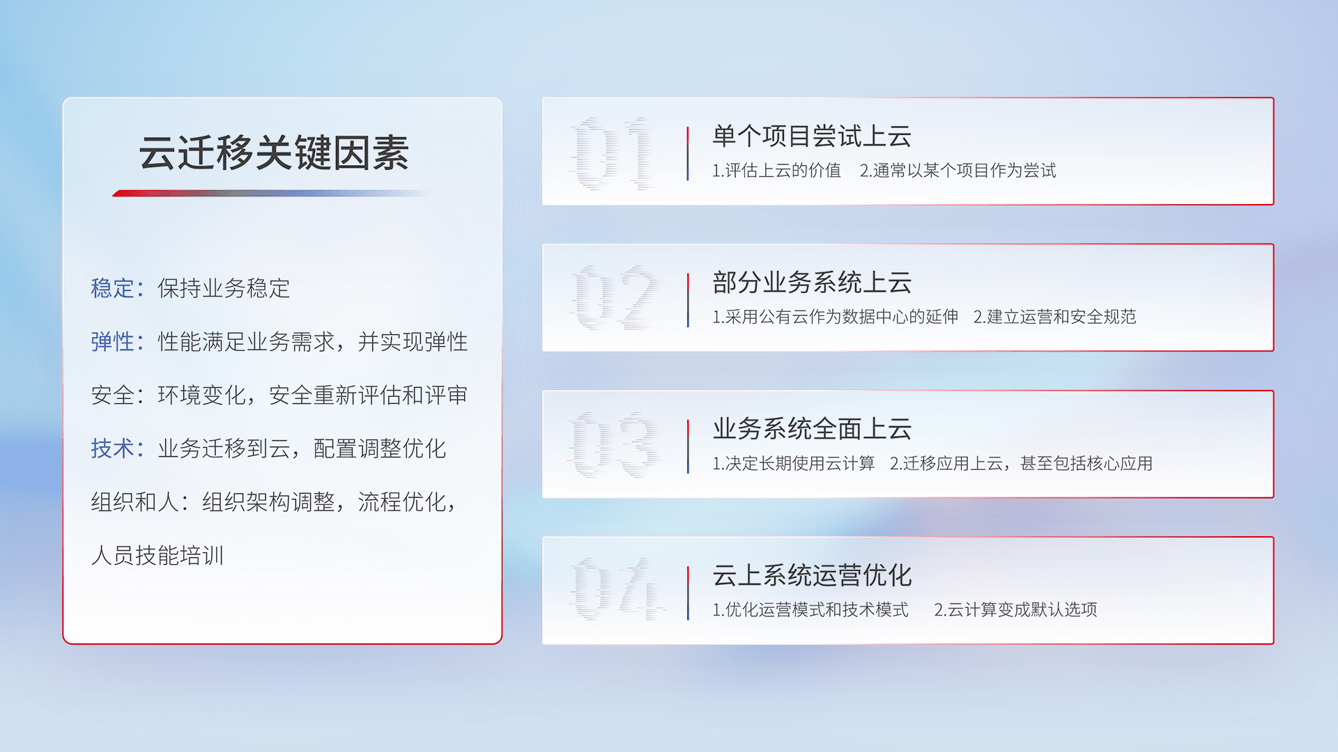 结合实际业务,,,从规划设计、、、、云平台选型、、云原生改造、、、数据迁移、、、、集成交付,,,迁移全过程为客户识别最佳上云路径,,,做好风险识别管理,,,,设计网络架构、、、、身份权限、、、、安全审计合规、、、、操作审计、、、日志审计、、监控告警策略、、、、多站点容灾设计等,,,对云上基础设施进行整体规划,,,提升IT治理水平,,,以满足弹性、、、高可用、、、、高性能的需求。。。。