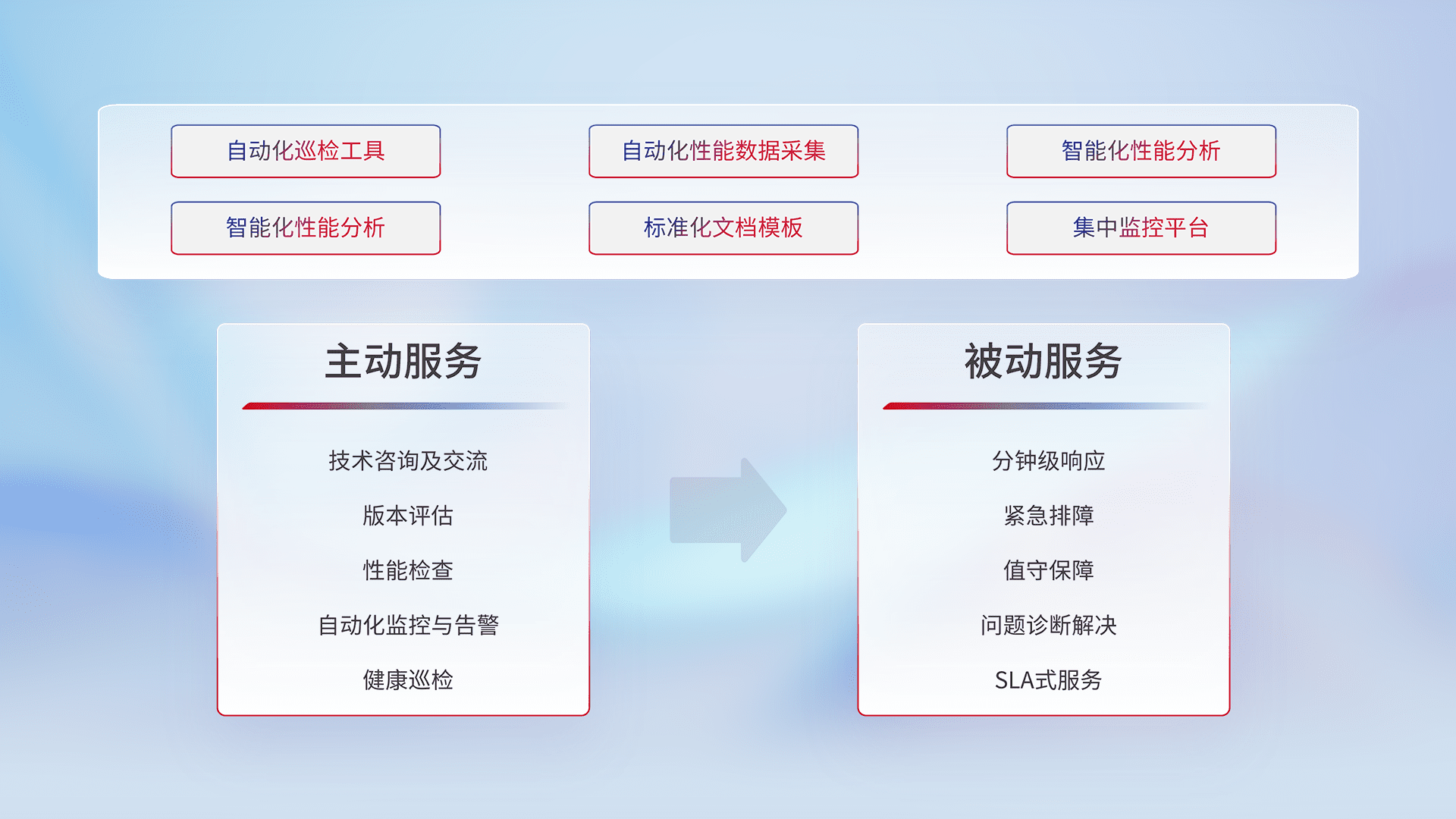 智能化工具和标准化文档,,,,保障服务质量,,,,提供主动服务(包含技术咨询、、、版本评估、、、、性能检查、、、自动化监控与告警、、健康巡检)和被动服务包含(分钟级响应、、、紧急排障、、、、值守保障、、、问题诊断解决、、SLA服务)。。